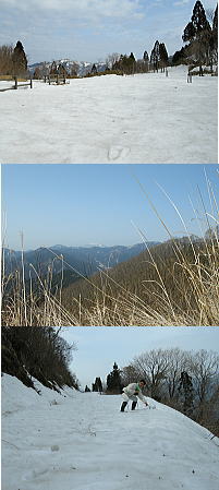 ここ数日の陽気で雪もすっかりとけたであろうと思い、簡単に考えて行ってみたものの、途中から後悔の嵐となりました。ひょっとしたらまだ雪が残っているかな・・・。というくらいの気持ちで行ったのですが、登山道に入ってから思い知らされました。標高750mを超えた辺りから積雪が30cmを超えるようになってきたのです。初めのうちは、鳥の声を聞きながらのんびり歩いていたのですが、だんだんと景色を見る余裕が無くなってきました。おまけに、途中で買ったお茶を車に忘れるし、携帯電話も持ってくるの忘れるしで、こりゃ無理はせんほうがいいなと思い、とりあえずダルガ峰林道までは行こうと決めました。