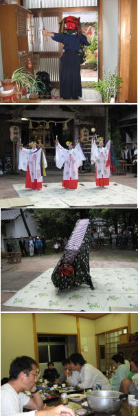 一番下の写真は、無事終わっての慰労の一コマ。私も獅子舞はこれで3度目ですが、だんだんキツクなってきました。同世代同士で、「もうこれで、獅子には入らなくていいだろう」と言っていましたが、考えてみると若衆がもっと増えない限りは抜けられないので、4年後もやはりやることになりそうです。