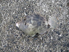 ■カワハギ(カワハギ科) 今年はサビキ釣りでよく釣れているようでした。もう少し大きければお持ち帰りしたのですが、これで20cm弱くらいです。言わずとしれた餌取り名人ですね。鍋にもってこいのお魚さんです。 |