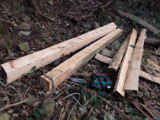 北野でわいたヒノキを道ばたまで運んだ後、木切り。